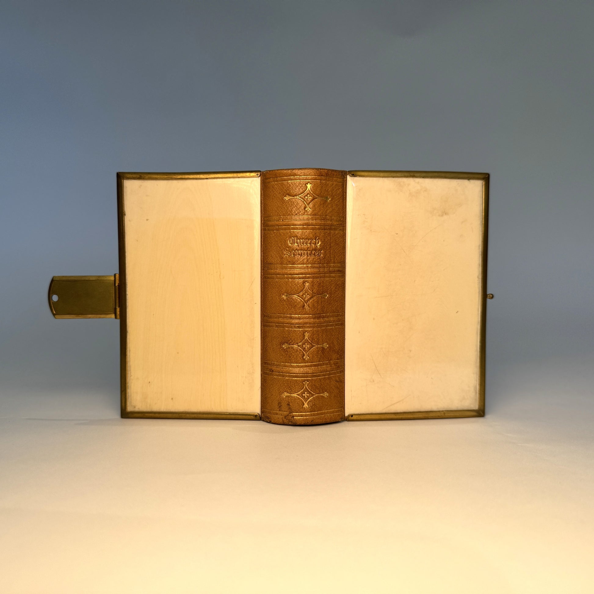 Binding: The book is bound in striking ivory boards. This luxurious material is complemented by elegant brass edges and a fully functional brass clasp, which is securely pinned to both the front and rear boards, ensuring the book remains protected. The spine is crafted from high-quality leather, featuring five raised bands and intricate gilt tooling, adding to the book's aesthetic appeal and durability.