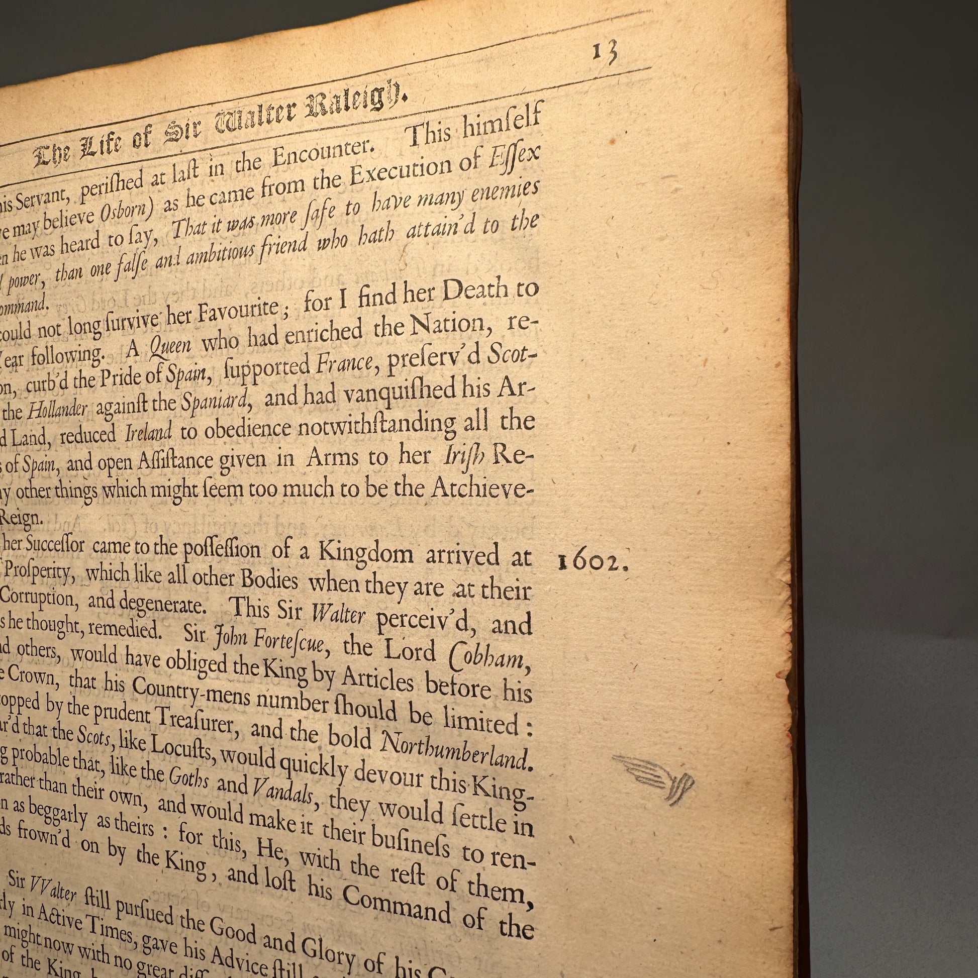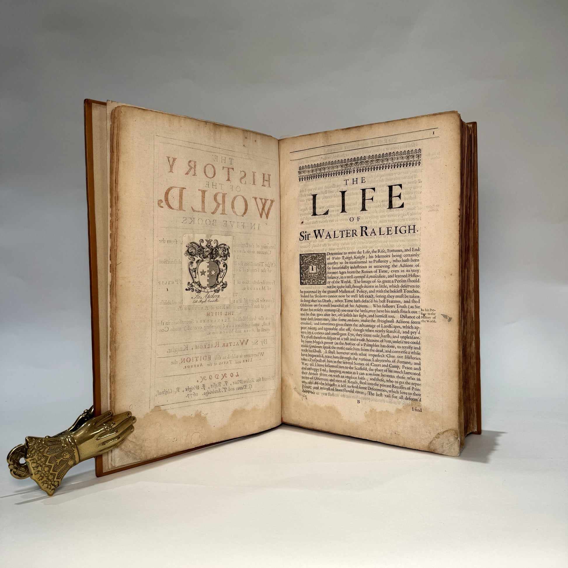 A substantial and handsome seventeenth-century edition of Sir Walter Raleigh’s History of the World, written during his imprisonment in the Tower of London between 1603 and 1616. This edition includes, as issued, “The Life of Sir Walter Raleigh,” “The Arraignment of Sir Walter Raleigh,” and related documentary material appended to the main text
