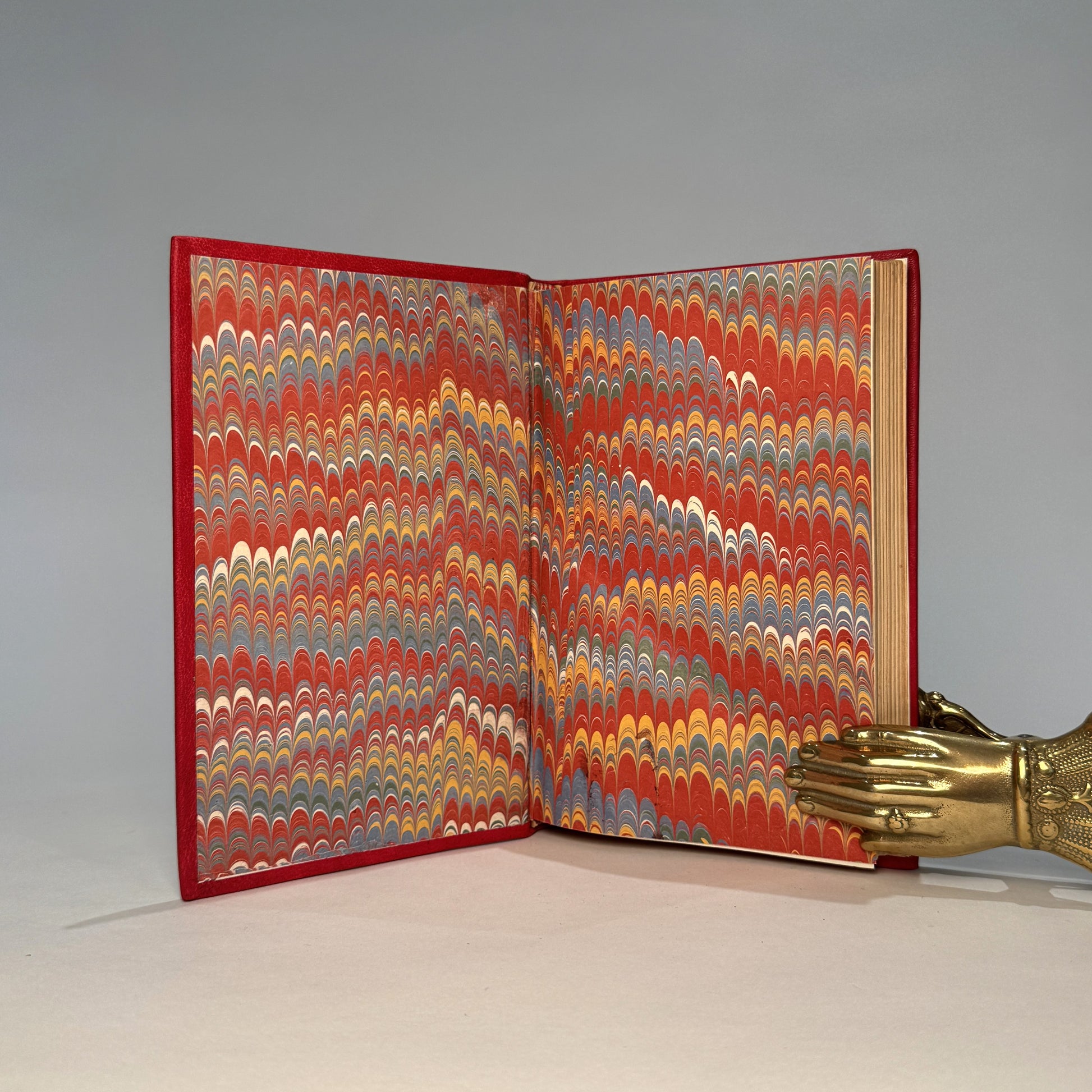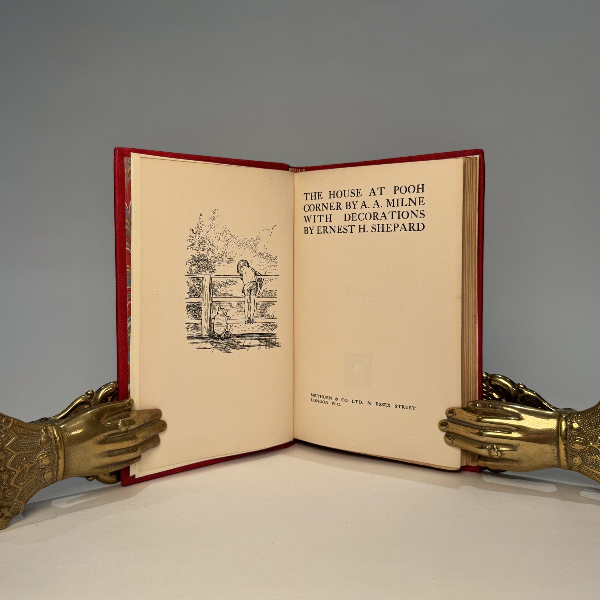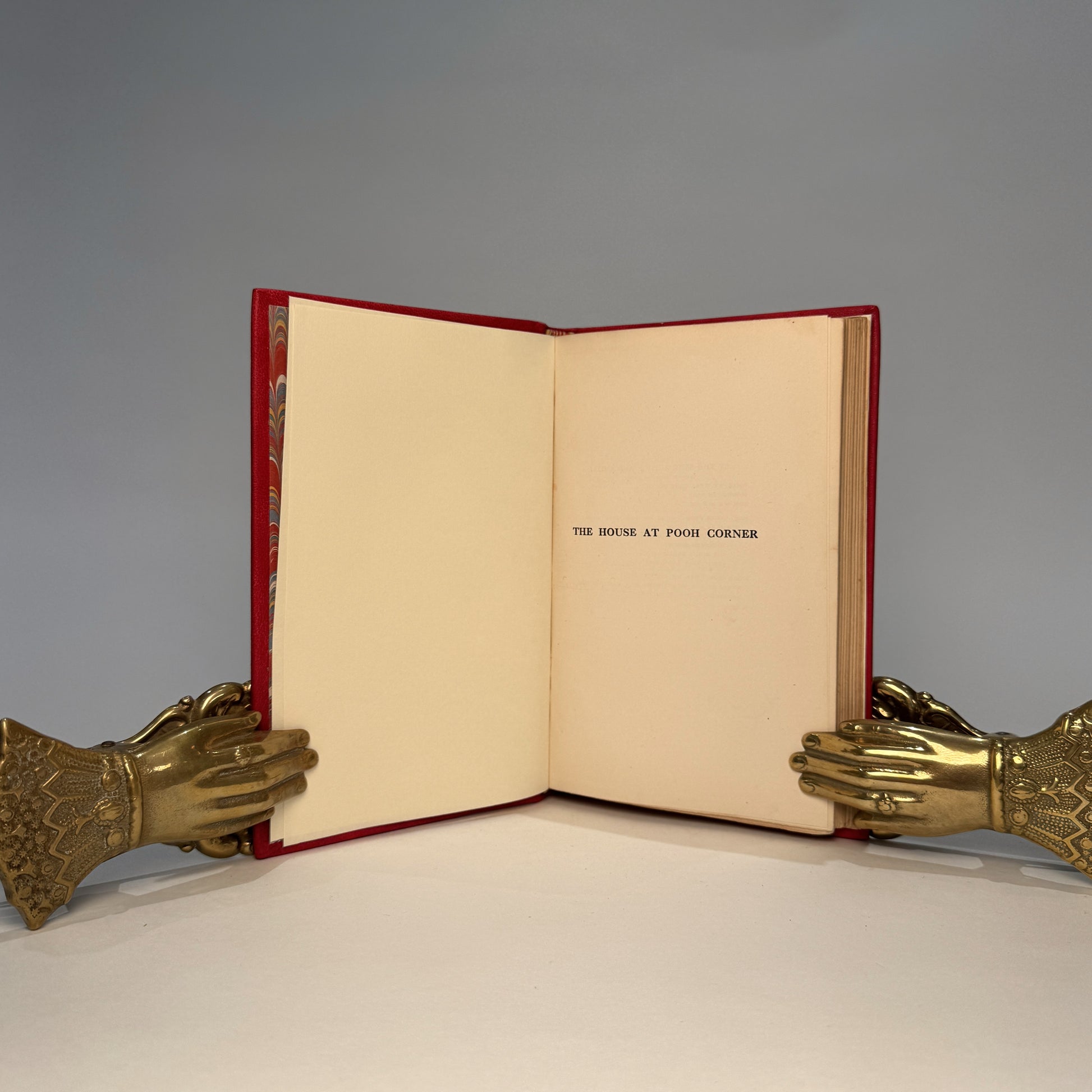 Octavo. A finely bound example of the first edition, first impression of The House at Pooh Corner, the fourth and final volume in A.A. Milne’s immortal Winnie-the-Pooh series. Bound in sumptuous full red morocco, with a gilt onlay to the upper cover depicting Christopher Robin and Pooh, gilt cornerpieces, and double fillet borders. The spine is richly gilt in compartments with floral motifs, ruled bands, and gilt lettering. The date is stamped at the foot. Hand-sewn silk headbands, marbled endpapers of striking hues, and all edges gilt complete this masterful presentation.